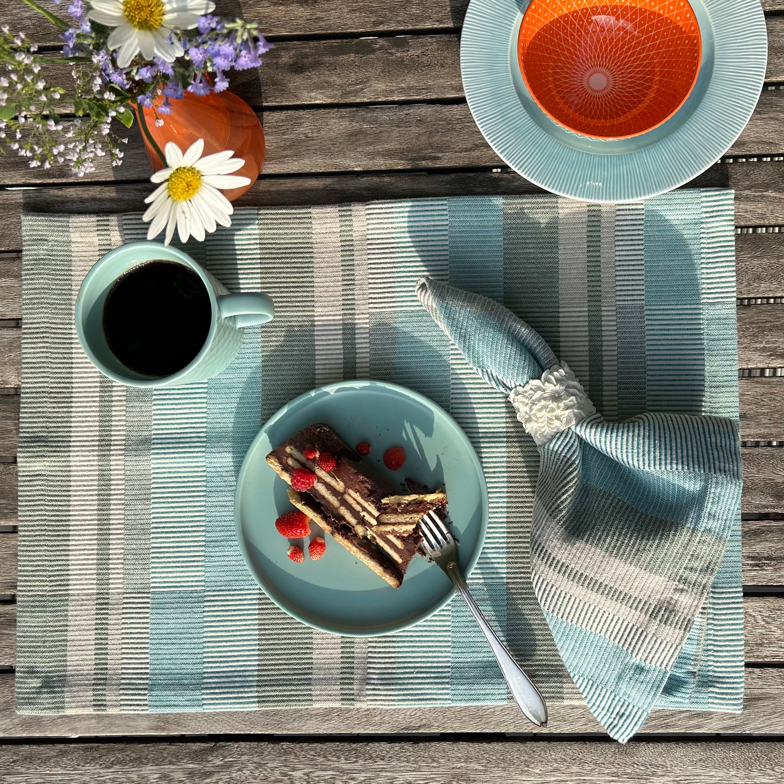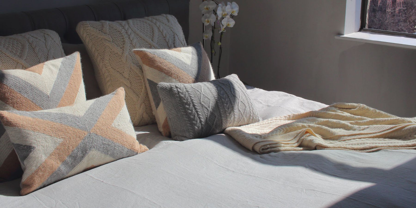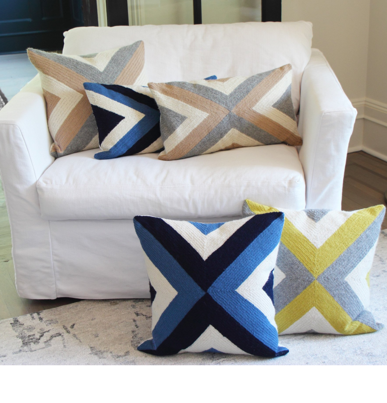Our Grinda pillows are named after a beautiful island in the Stockholm archipelago and inspired by the flags of the boats sailing by. Each one is hand embroidered by artisans 7000 miles away in Peru.