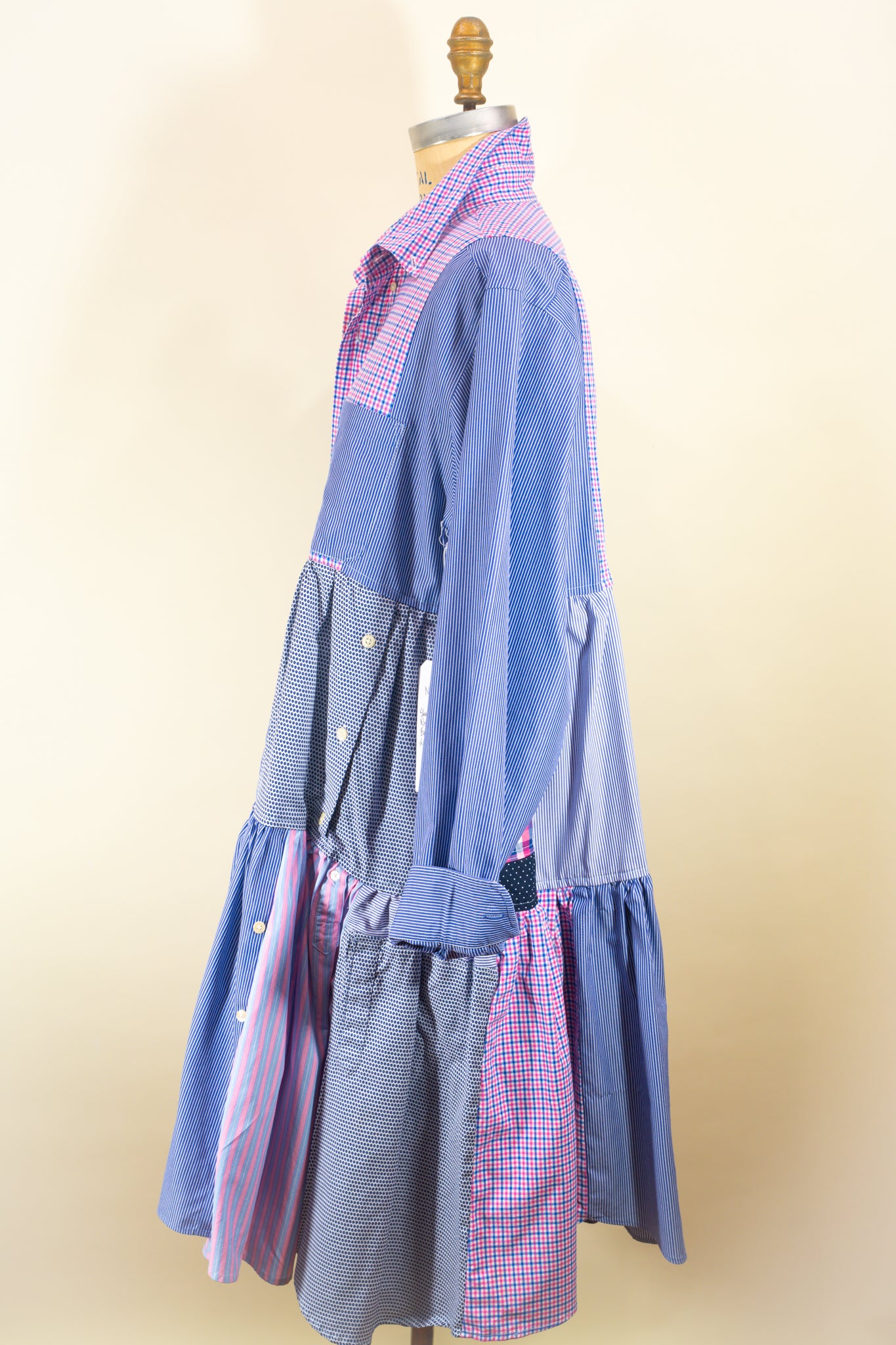 Now, two years later, the Montclair Reconstructed Shirt Dress has officially arrived! Each one-of-a-kind piece is handcrafted, cleverly using the original plackets, cuffs, and buttons as design elements to cut waste and crank up the style. And Johanna organically combines the patterns and stripes in each bespoke garment to command attention with perfect balance.